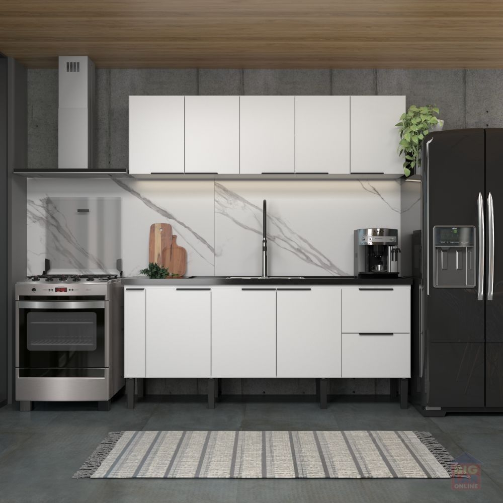 O Gabinete para Cozinha em Madeira Cisne 85x194cm Branco da Cozimax é elegante e sofisticado, fabricado com chapas de madeira com acabamento em cor fosca em todo exterior, possui porta condimentos em aço, prateleira e divisão interna para organizar utensílios, duas gavetas com puxadores exclusivos em estilo minimalista e uma gaveta embutida, dobradiças com amortecimento e pés na cor preta com regulagem de altura.
