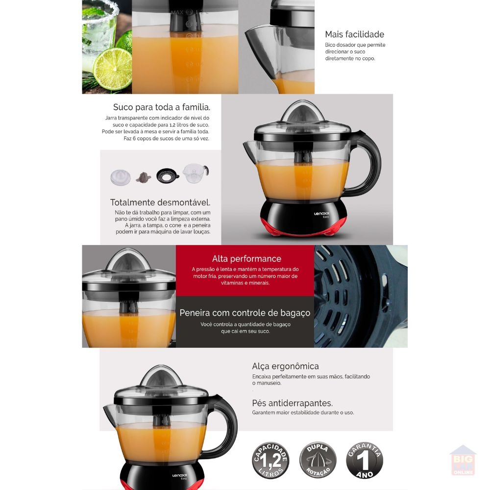 A jarra possui um design moderno com capacidade de 1,2 litros e pode ser levada à mesa. Conta ainda com um bico afunilado e uma peneira que ajuda a separar as sementes do suco.