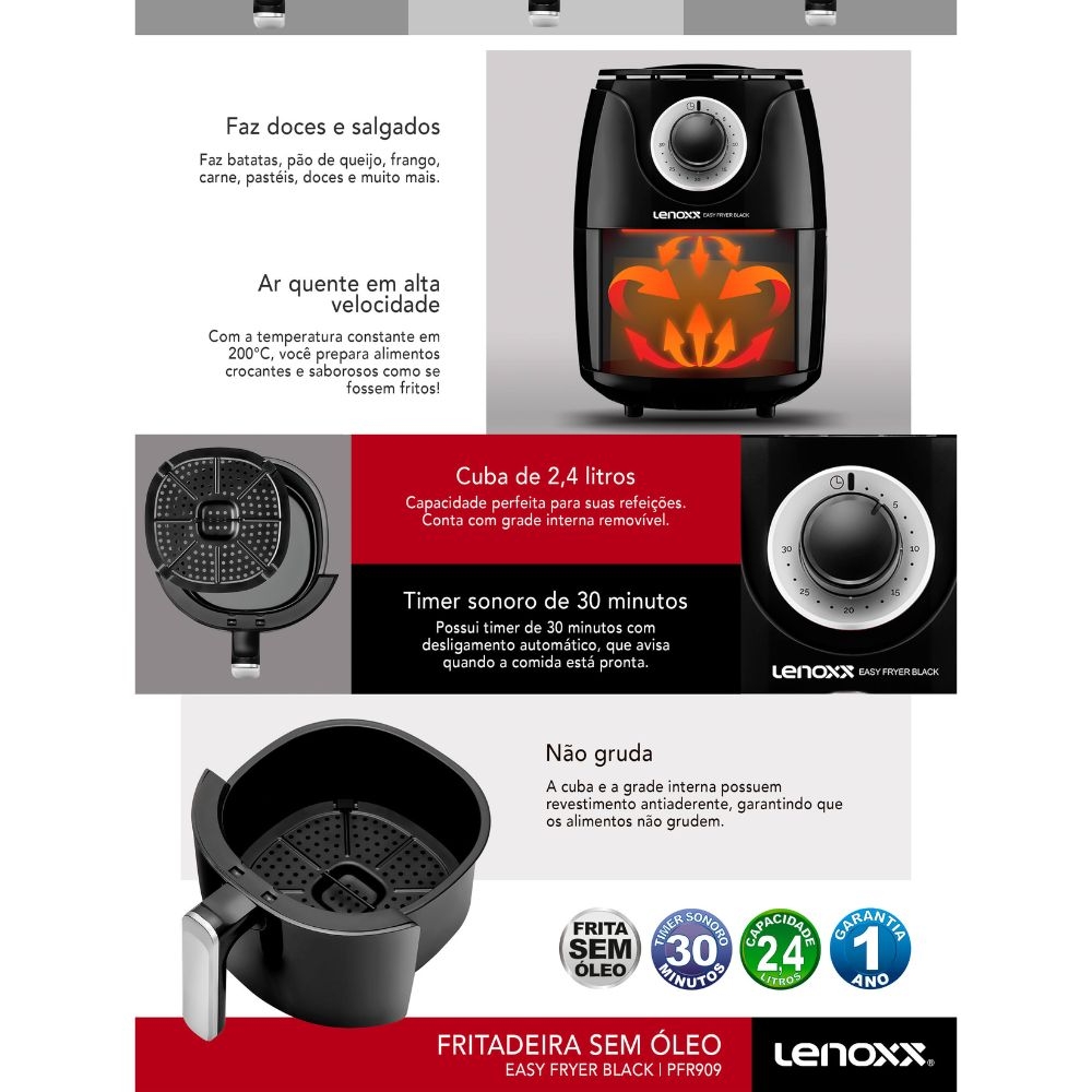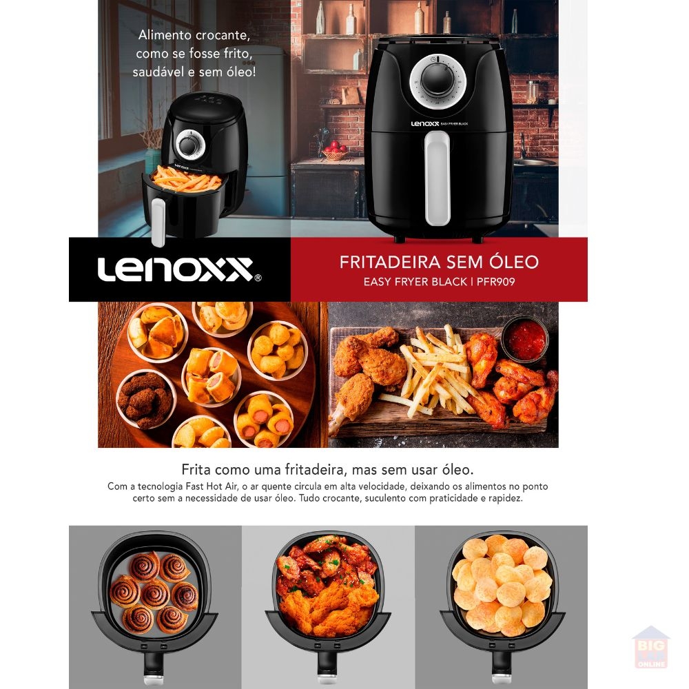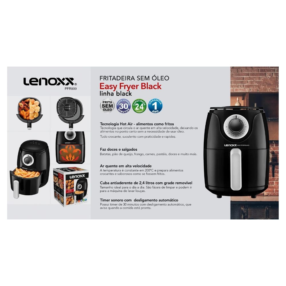 A Easy Fryer Black Lenoxx é moderna, compacta e prática! Tem a capacidade de 2,4 litros,sendo ideal para o preparo de alimentos no dia a dia ou quando está com pressa, mas não abre mão de uma refeição saudável. A tecnologia Fast Hot Air permite que o ar circule em alta velocidade proporcionando crocância por fora e maciez por dentro em todos os alimentos. Muito mais praticidade para o seu cotidiano de maneira ainda mais saudável e rápida. Compacta e funcional, conta com timer sonoro de até 30 min avisando que a comida está pronta, alcança a temperatura de até 200ºC, a grade interna é removível e tem acabamento antiaderente.