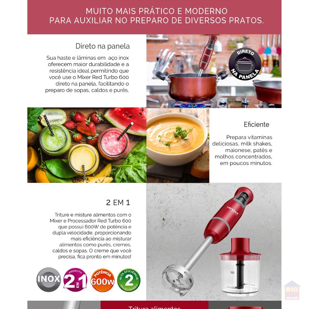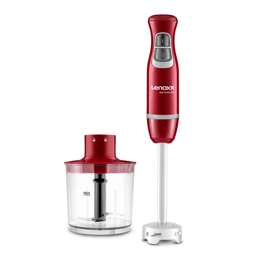 Aproveite toda a praticidade e modernidade do Mixer e Processador Red Turbo 600! São 2 funcionalidades no mesmo produto, seja para triturar alimentos ou preparar molhos, maioneses, bater caldos, esse é o eletrodoméstico ideal para a sua casa.