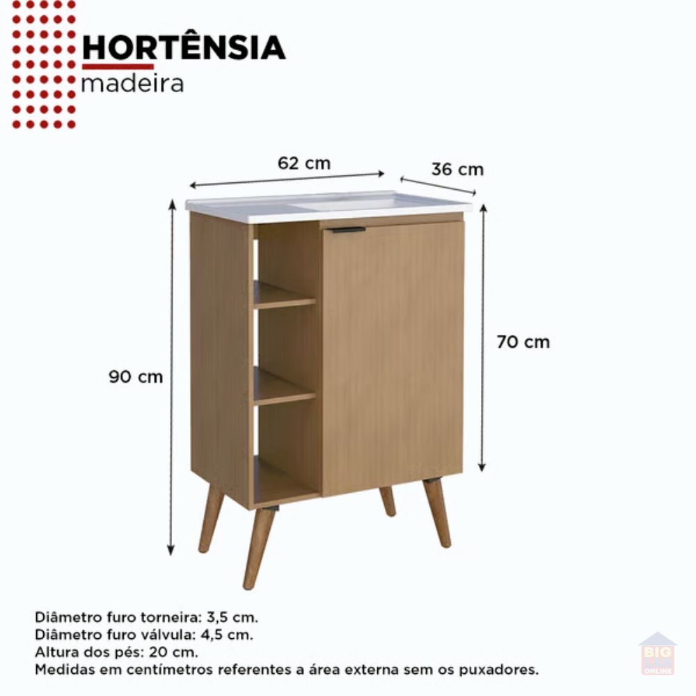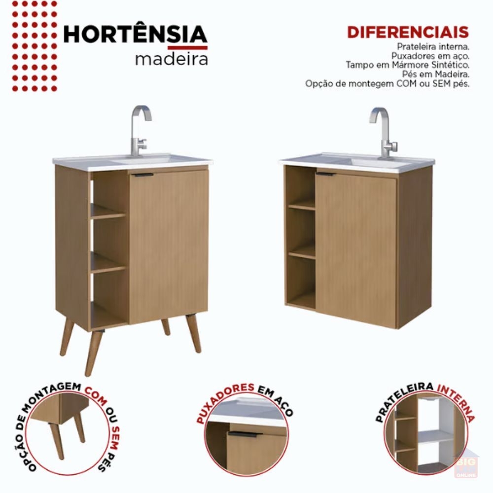 O banheiro em madeira Hortênsia da Cozimax foi produzido pensando em você que gosta de um ambiente com estilo mais clássico. Com os pés sendo opcional, o Hortênsia conta com puxadores em aço, lavatório em mármore sintético com borda sobreposta e prateleira interna para você armazenar todos os seus itens.