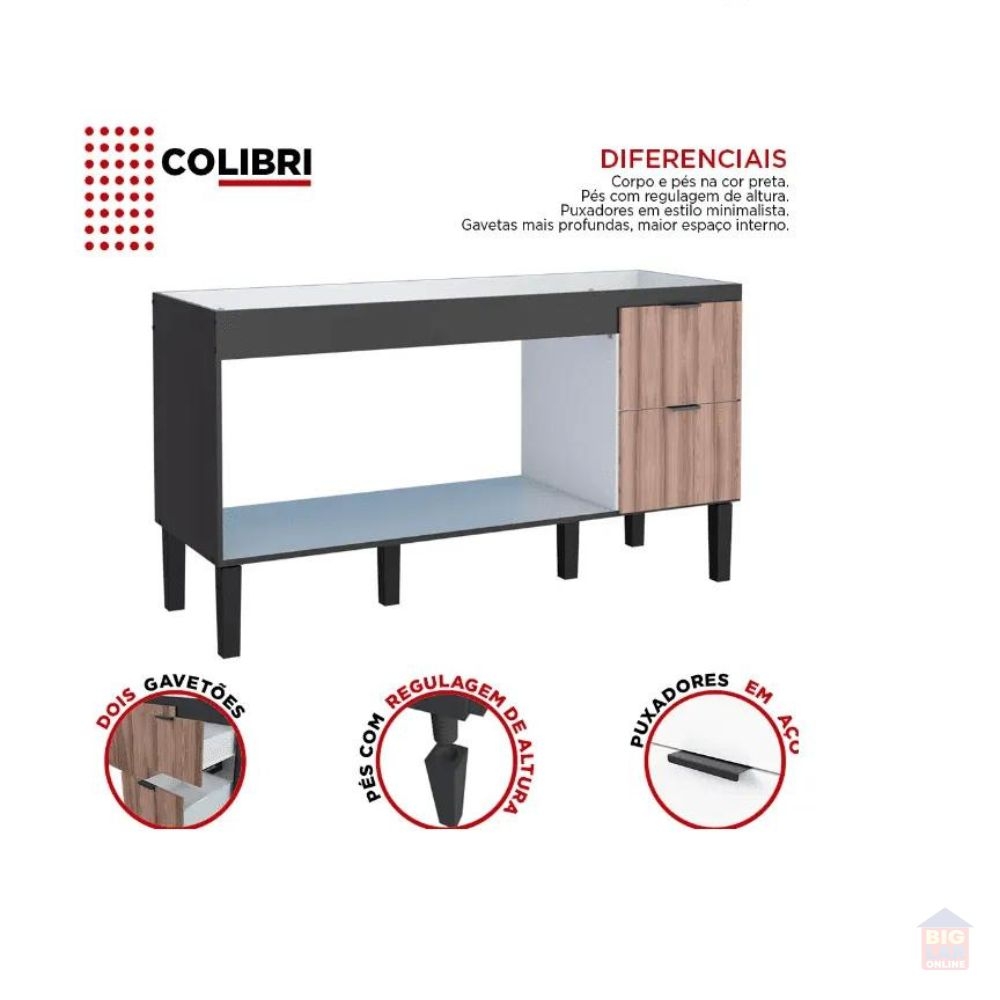 A linha de armários para cozinha Colibri, da Cozimax, possui estilo simples e design moderno, fabricado com chapas de madeira, possui um amplo espaço interno, dois gavetões com puxadores exclusivos em estilo minimalista e pés na cor preta com regulagem de altura.