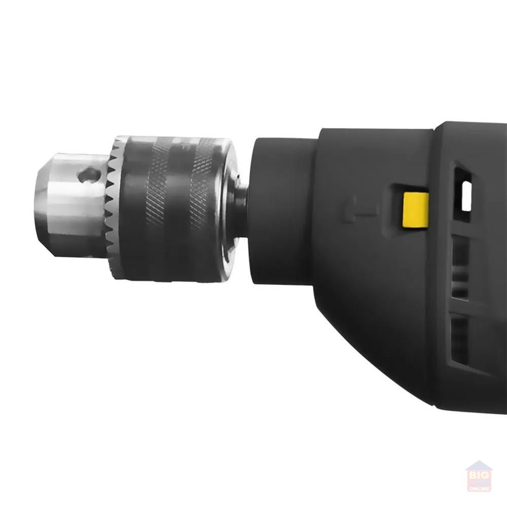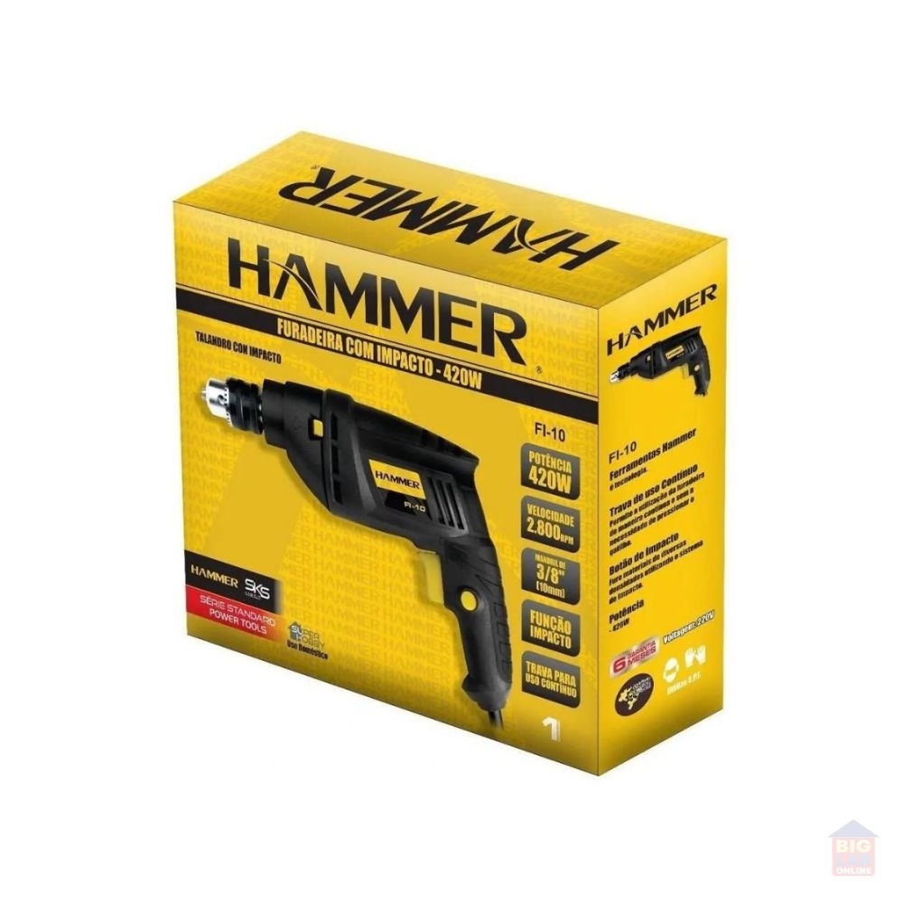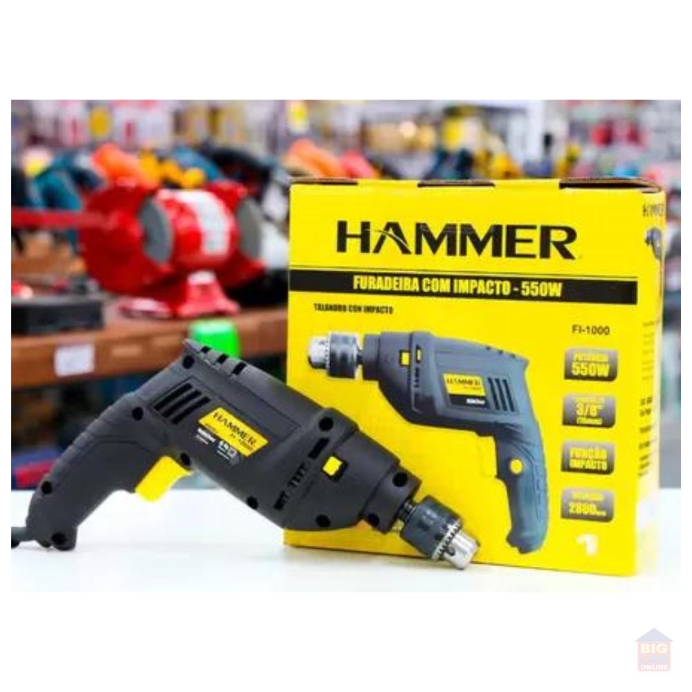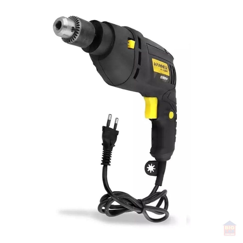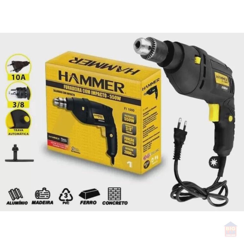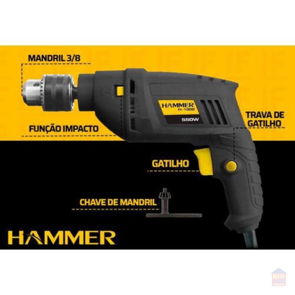 Furadeira Hammer F1000 com trava para uso contínuo e seletor de modo de perfuração/impacto. Utilizado para perfuração, no modo sem impacto, para perfurar madeira, aço, ferro, plástico e acrílico. No modo impacto é indicado para alvenaria e concreto.
