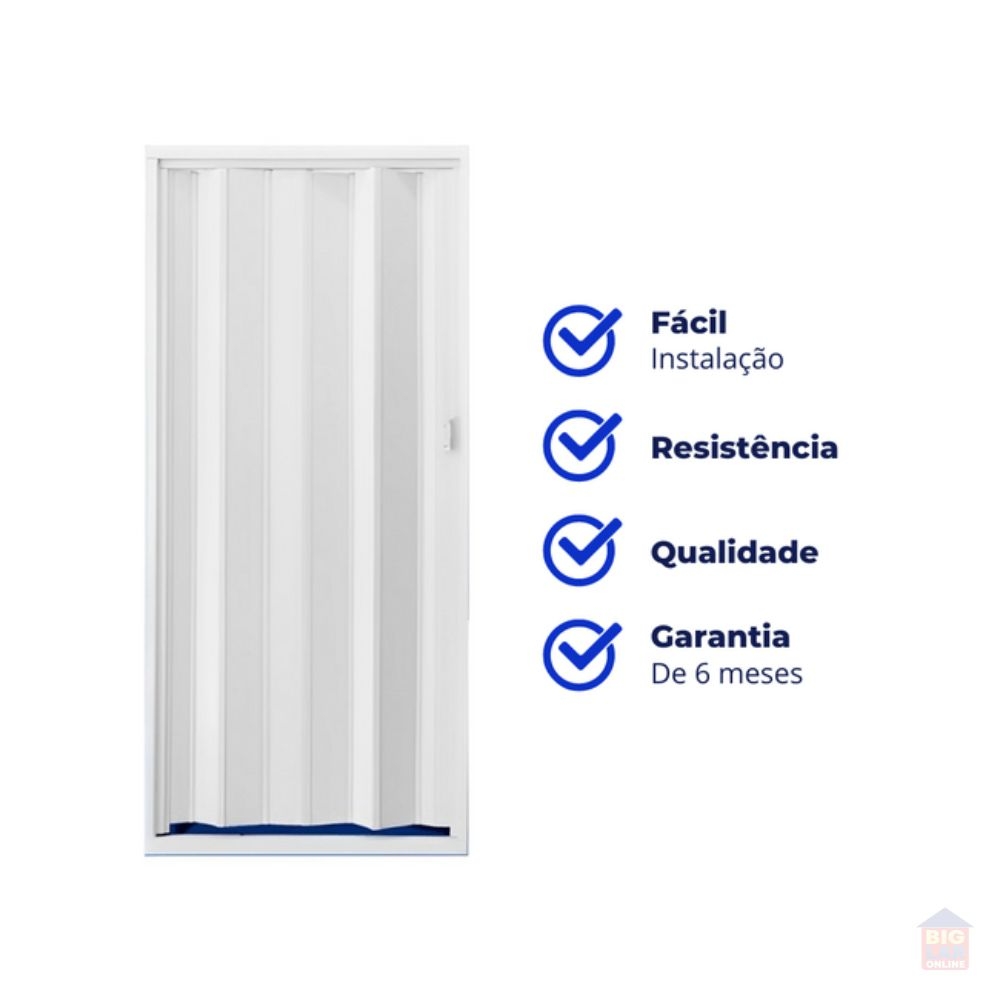 Feita de plástico PVC, esta porta sanfonada é indicada para ambientes pequenos, pois não ocupa espaço ao abrir e fechar. Possui fácil instalação com uma largura de 80 centímetros. Ideal para seu ambiente interno!