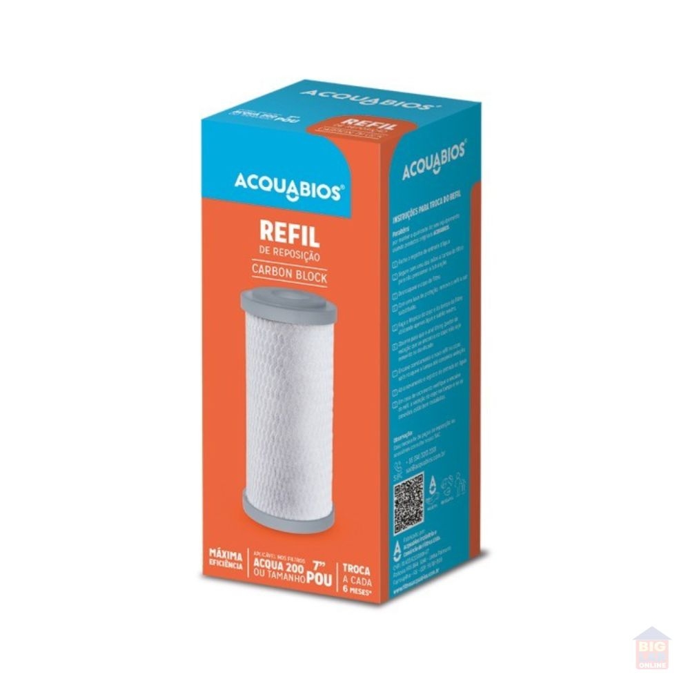 A linha de refis tipo Carbon block é fabricada com tecnologia exclusiva ACQUABIOS. Esta linha conta com uma moderna planta de fabricação de refis de carvão ativado natural e atóxico. Em sua montagem são utilizadas duas camadas de não tecido, interno e externo para reter partículas suspensas na água. Fabricado através de um rigoroso processo de inspeção de matérias-primas.