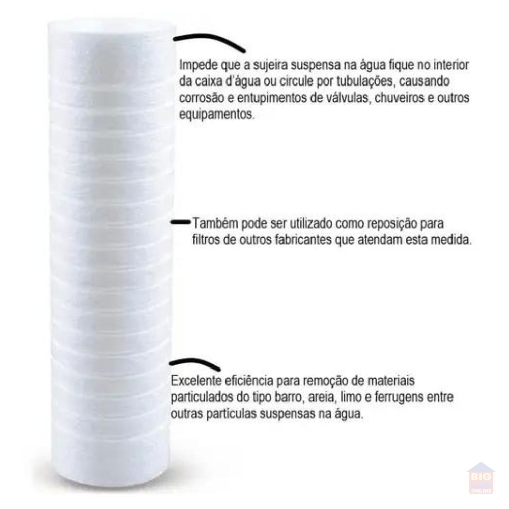 Recomendado para uso logo após o hidrômetro junto ao cavalete, antes da caixa d’água ou no seu interior antes da boia. Também pode ser instalado como pré-filtro em equipamentos que utilizem água em seus processos. Elemento filtrante fabricado com tecnologia "Melt Blown", em polipropileno, com acabamento ranhurado.