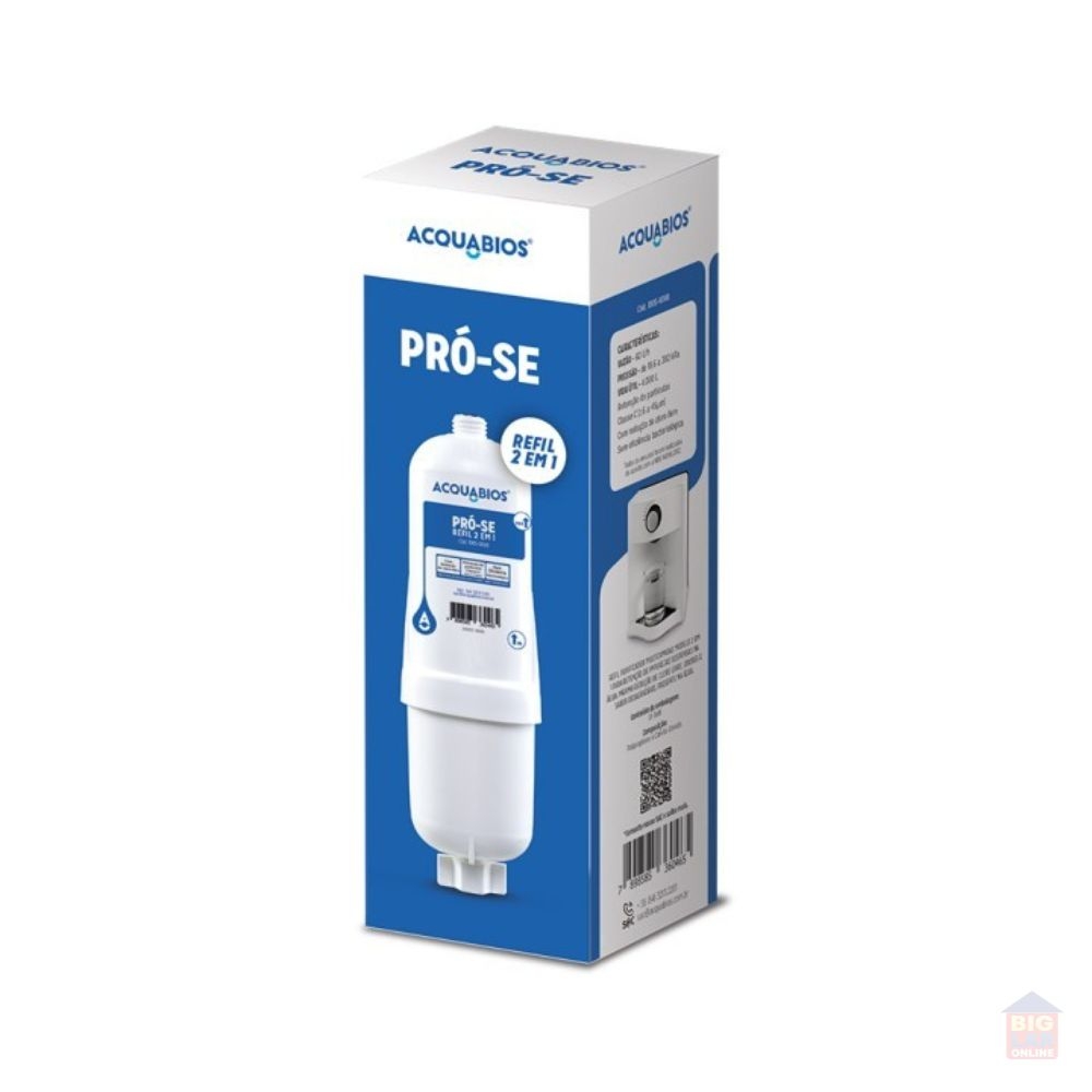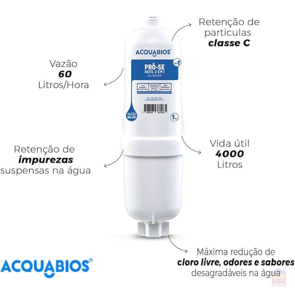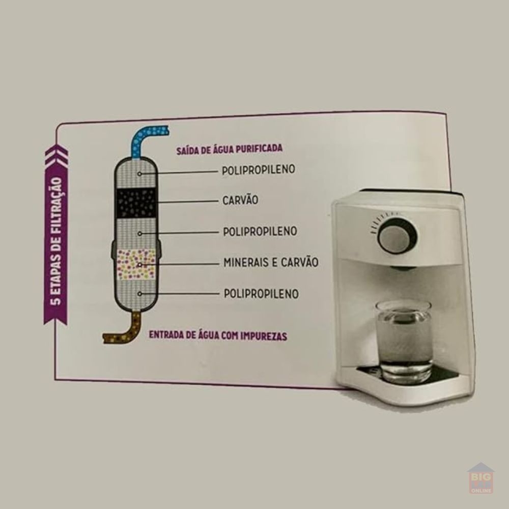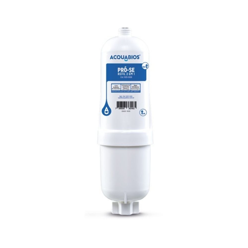 Refil purificador multicamadas modelo 2 em 1 para retenção de impurezas suspensas na água, máxima redução de cloro livre, odores e sabor desagradável na água.