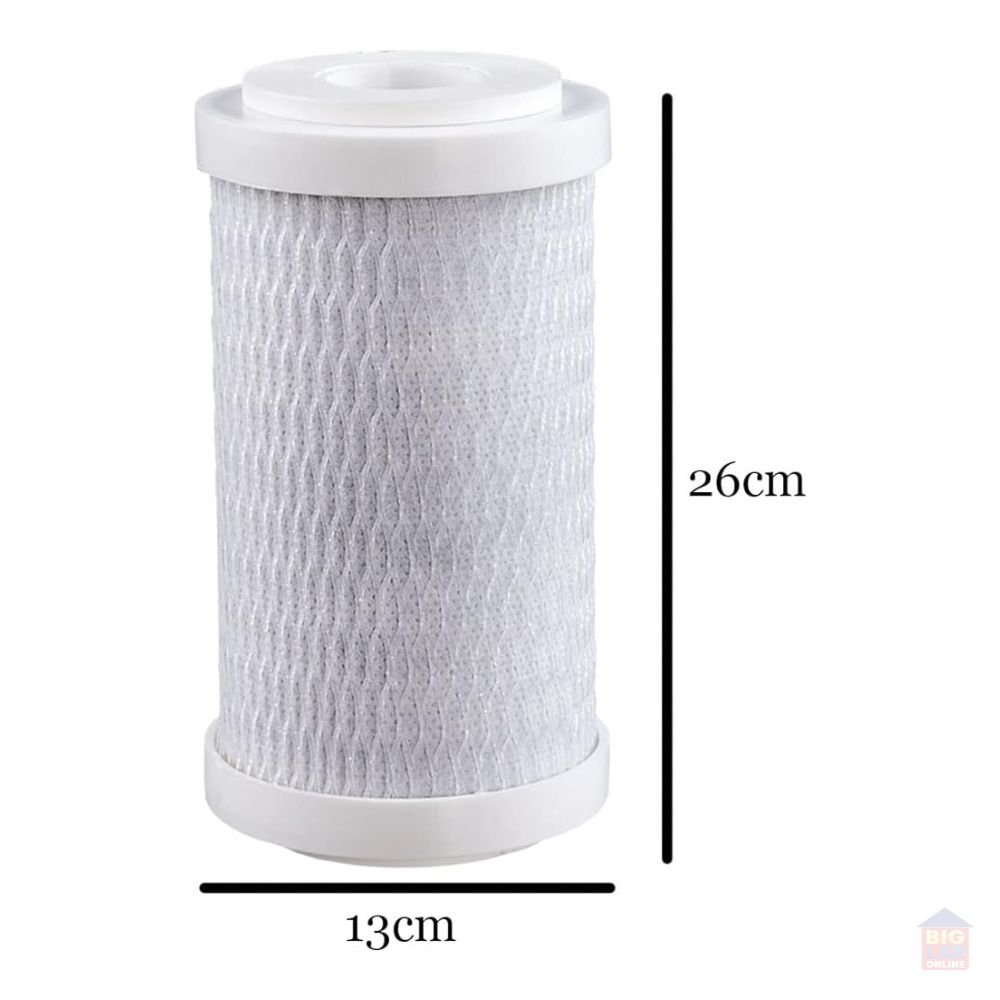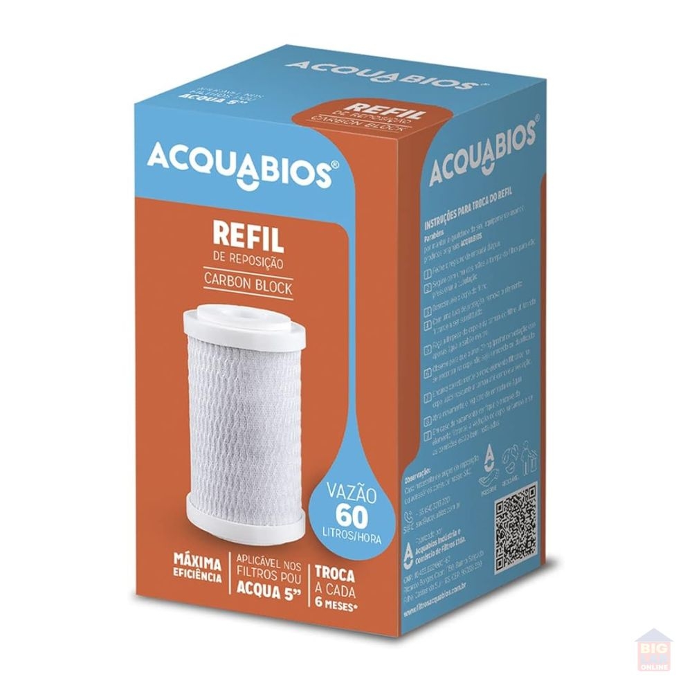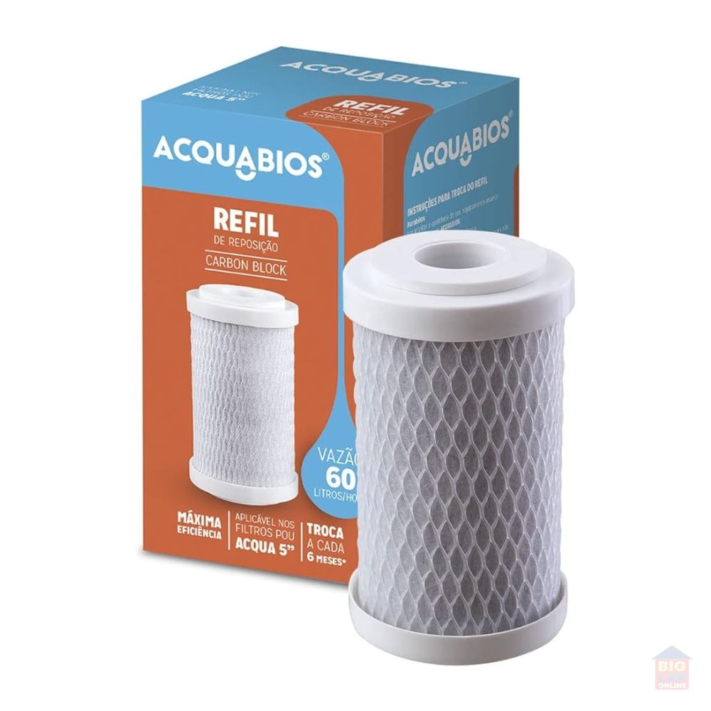 Alta eficiência de decloração, retira odores e mau gosto da água. Para uso em filtros tipo POU (ponto de uso), Acqua 5" BR/TR ou outras marcas de filtros tamanho 5". A linha de refis tipo Carbon block é fabricada com tecnologia exclusiva ACQUABIOS. Esta linha conta com uma moderna planta de fabricação de refis de carvão ativado natural e atóxico. Em sua montagem são utilizadas duas camadas de não tecido, interno e externo para reter partículas suspensas na água.