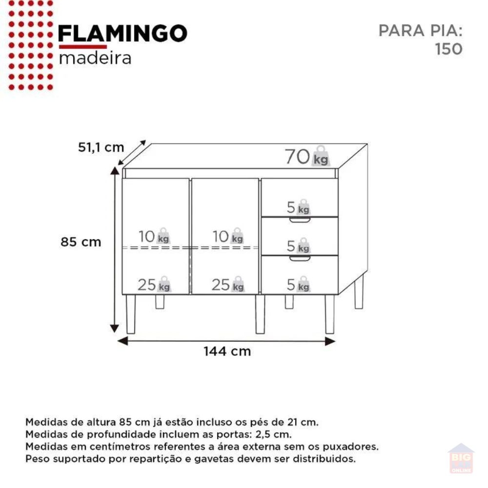 O Flamingo possui gavetas com corrediças telescópicas, exclusivos puxadores em aço eletrogalvanizado da Cozimax, e pés com regulagem de altura em polipropileno virgem na cor preta, que não ressecam e não quebram. Produtos vendidos separadamente.