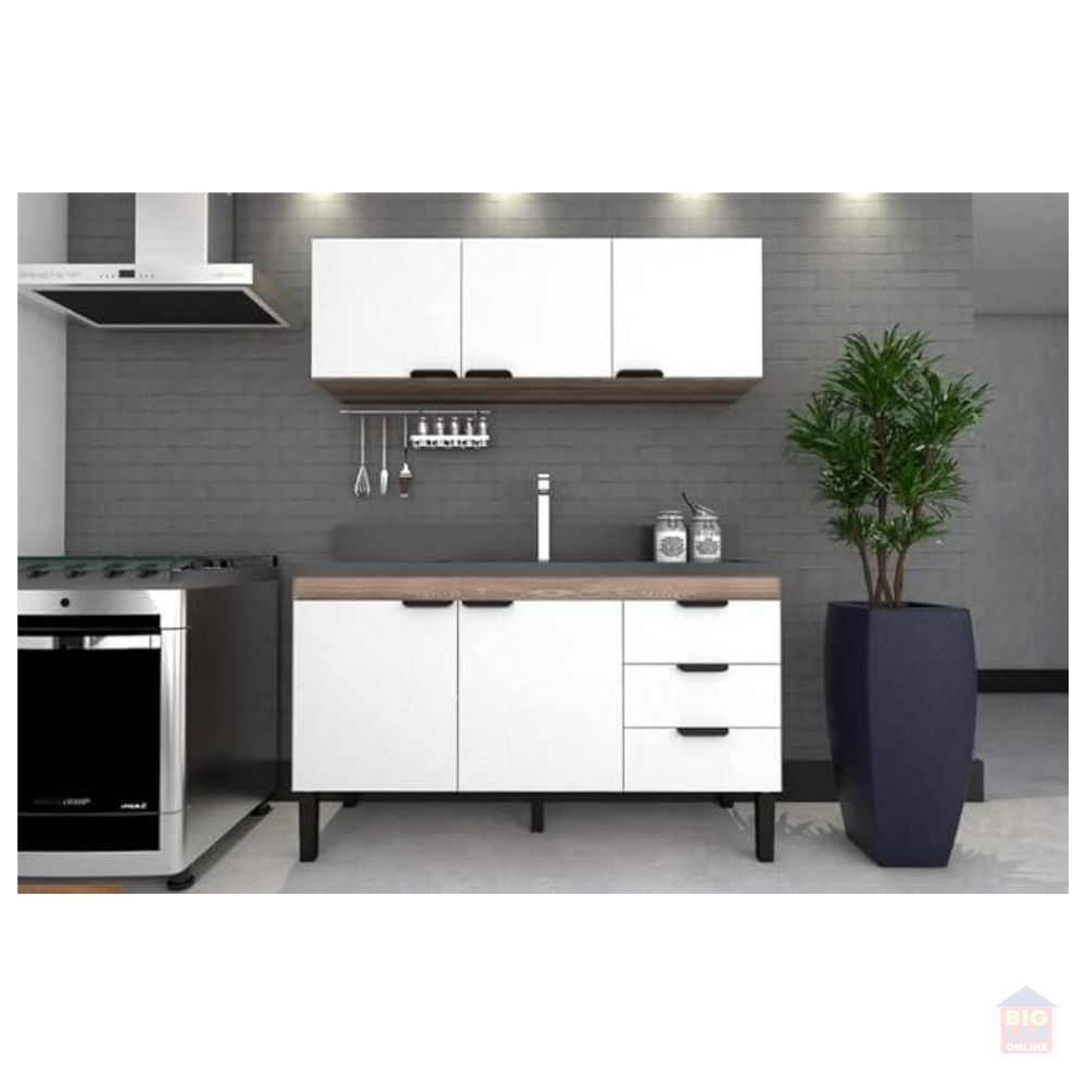 O Gabinete de Cozinha em Madeira Flamingo apresenta combinações da cor madeirada com portas em branco ou preto semi brilho.