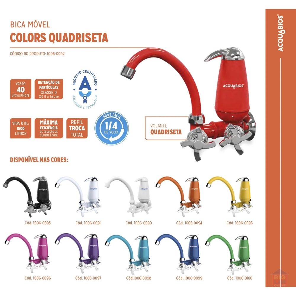 Filtro Torneira Bica Móvel Acquabios ColorsAs cores da Linha Colors foram escolhidas pensando no conceito retrô. Este conceito remete a recriação ou reedição de objetos e utensílios utilizados nos anos 70 e 80.