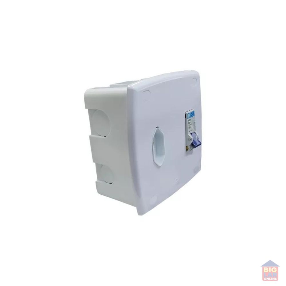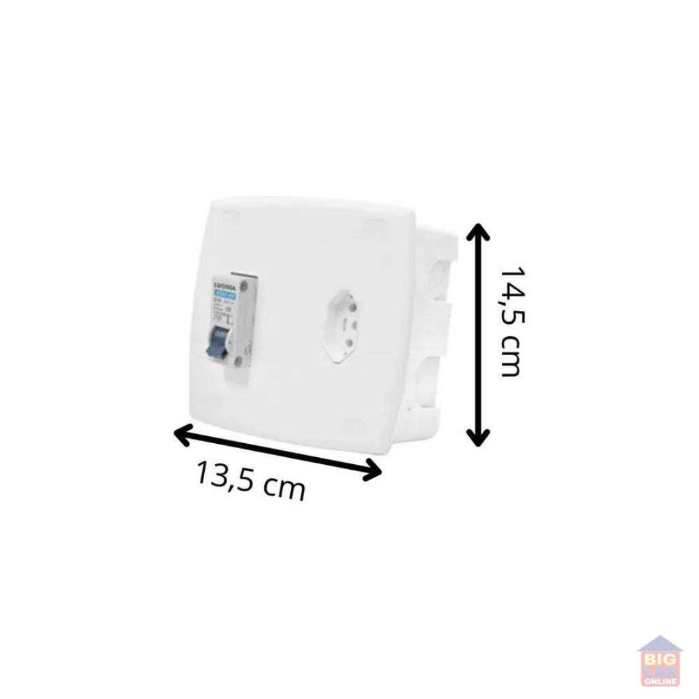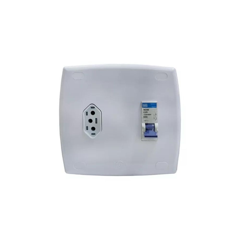 A caixa inclui: · 1 Tomada de 20A; · 1 Disjuntor C25 ~230/400V da marca WEQ.
