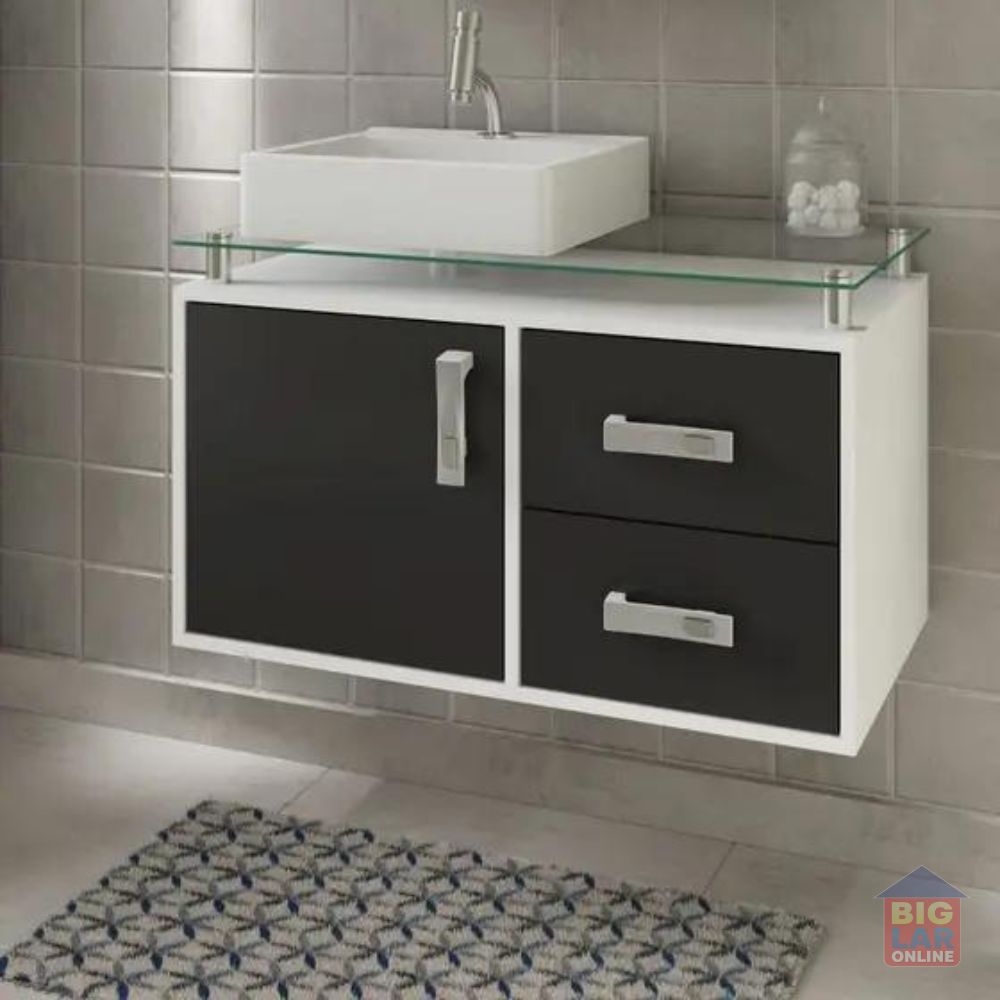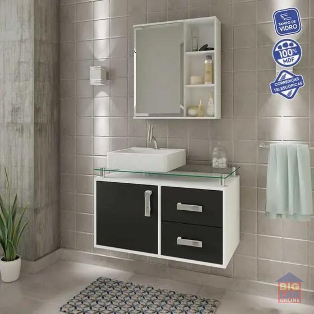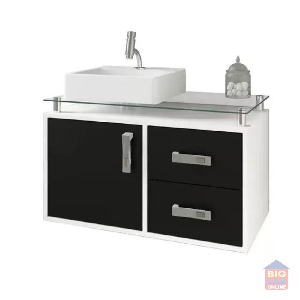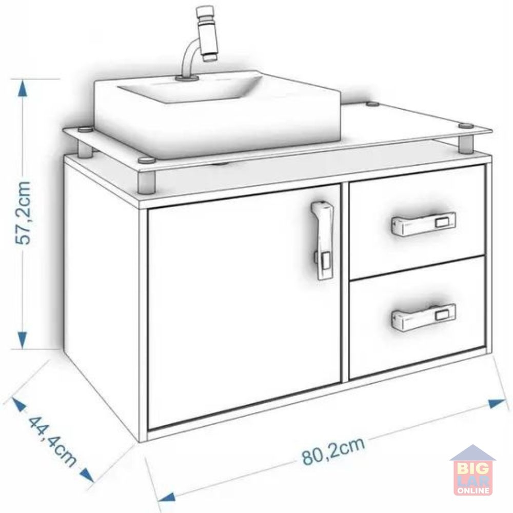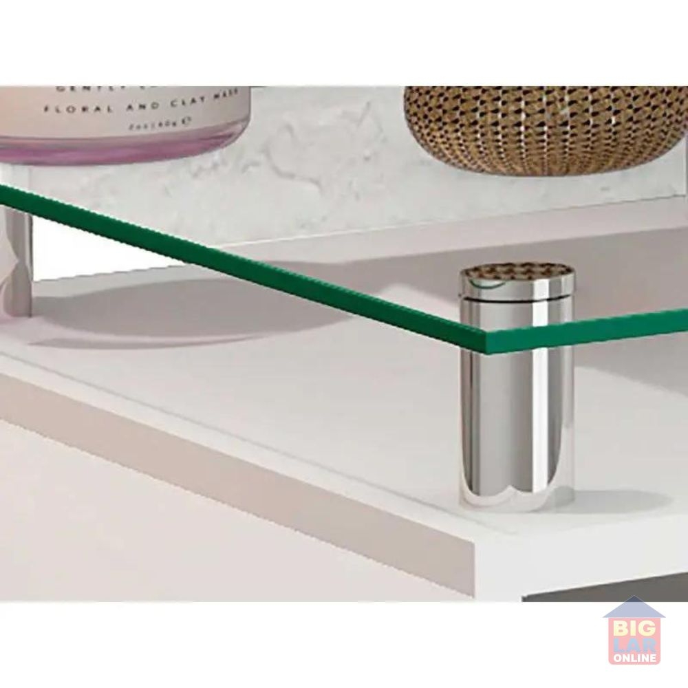 O balcão conta com tampo em vidro temperado e cuba em mármore sintético, garantindo qualidade e design ao móvel.