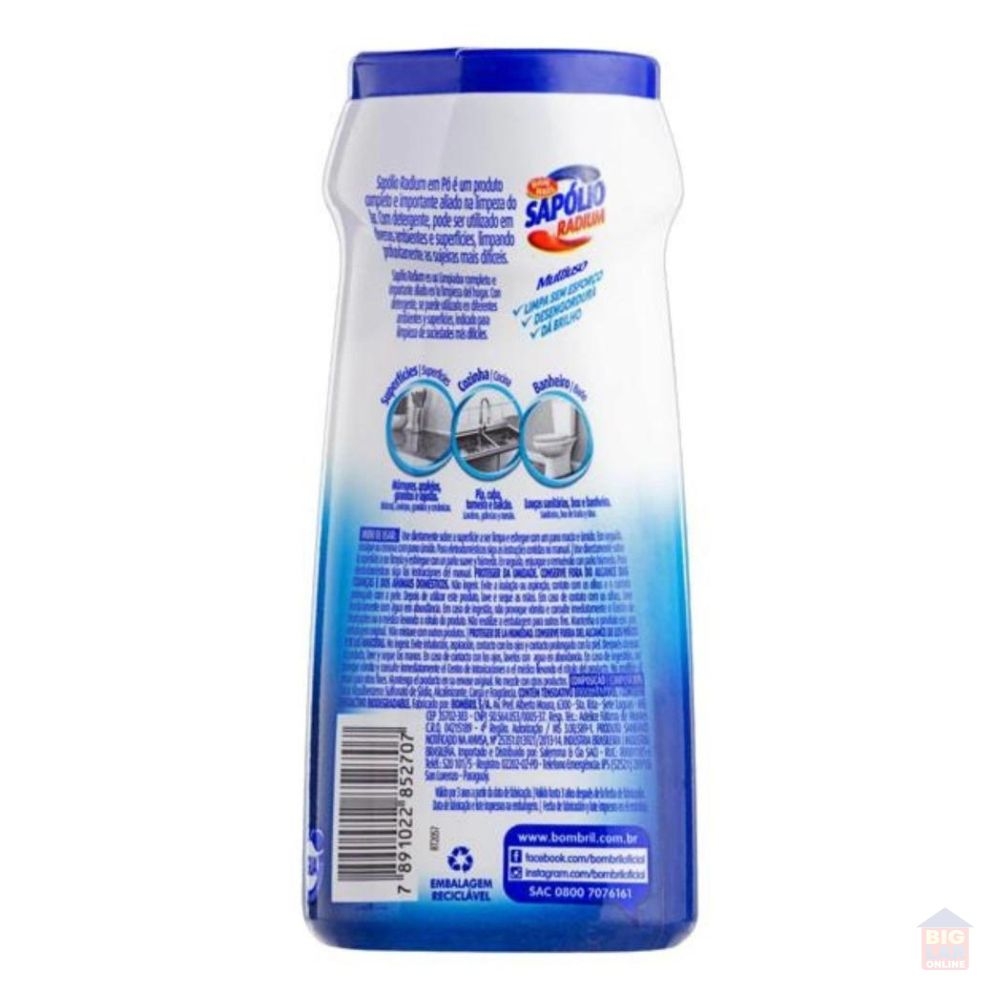 O Sapólio Radium em Pó possui alta abrasividade, e elimina as sujeiras que dão ainda mais trabalho, sendo utilizada aplicando-os diretamente na superfície, ou diluído em água. É perfeito para remover as sujeiras das porcelanas, louças sanitárias, pisos e vidros deixando-os limpos como novos.