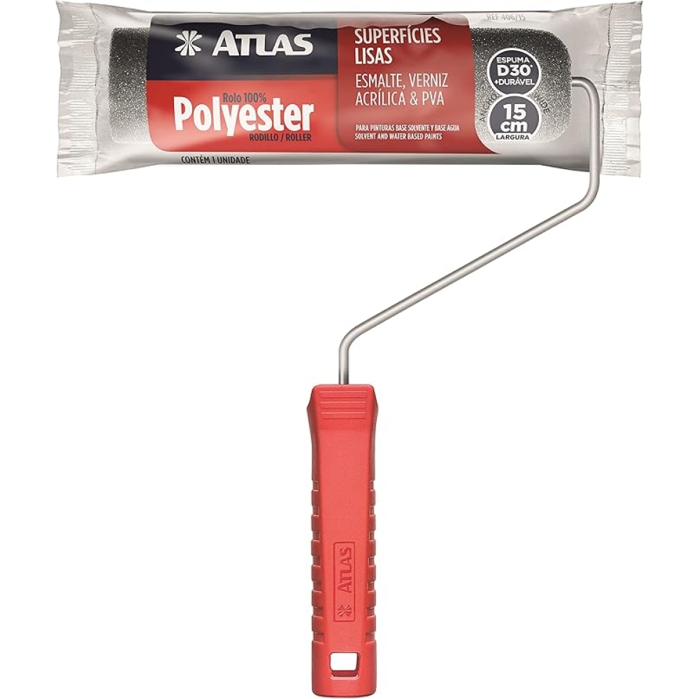 Garfo e Rolo de Espuma para Pintura, 15 cm, Cor Cinza, Atlas. Produzido com material resiste a solventes mineiras o rolo de espuma é composto 100% por poliéster. Indicado para uso em superfícies lisas onde garante melhor performace.