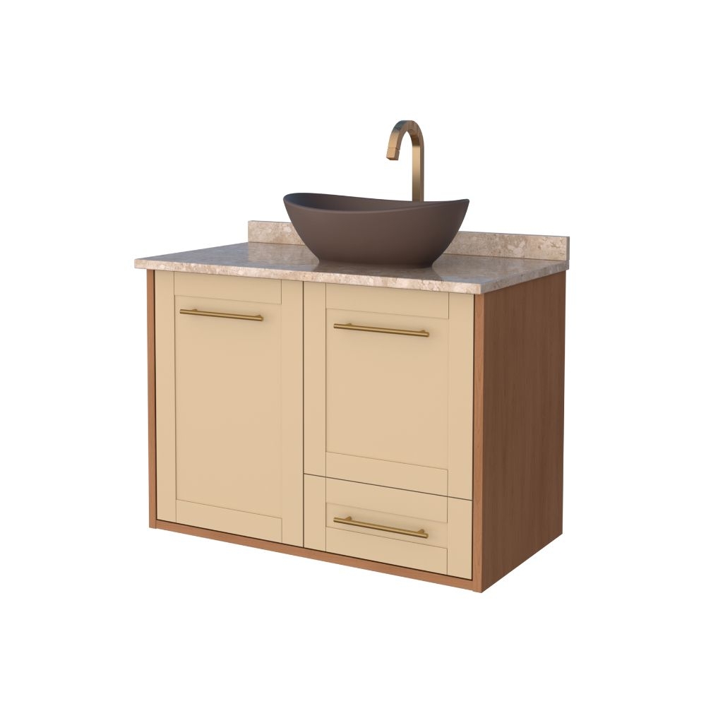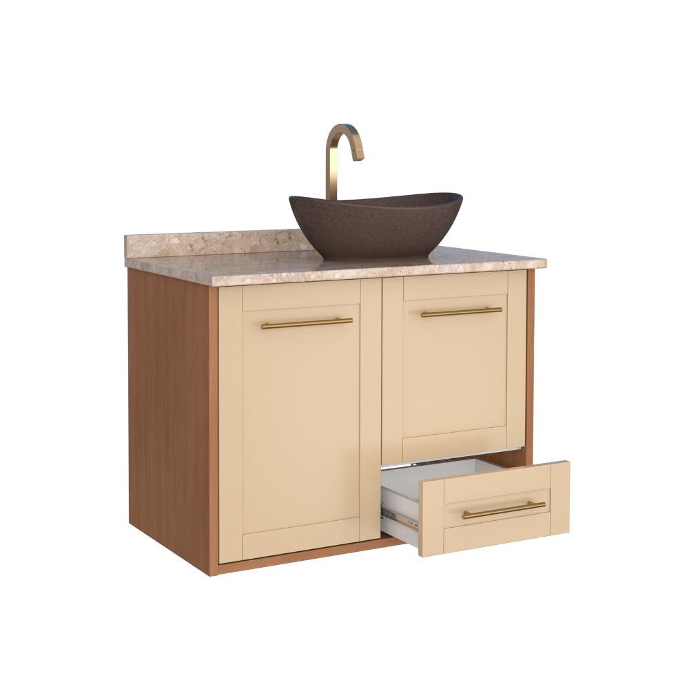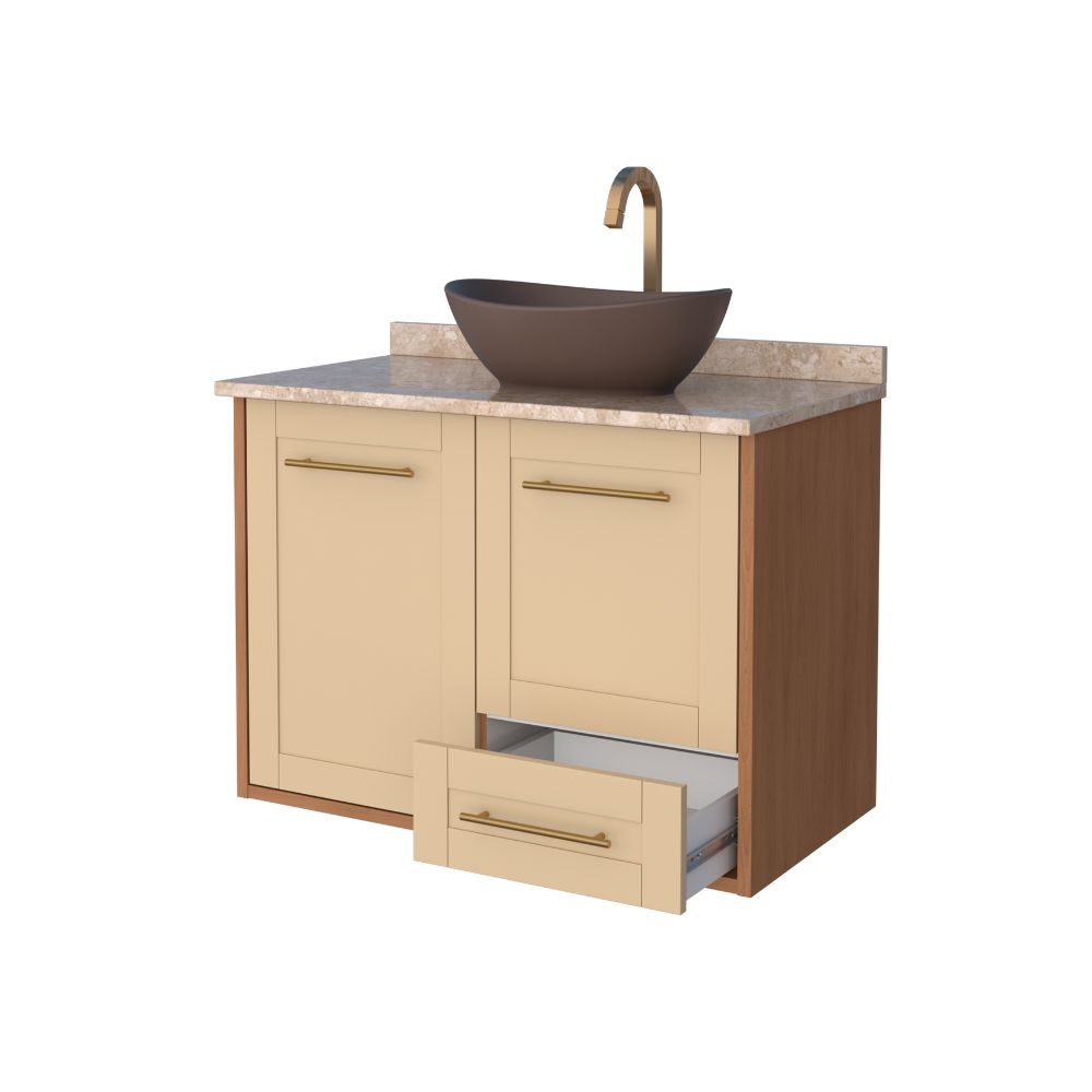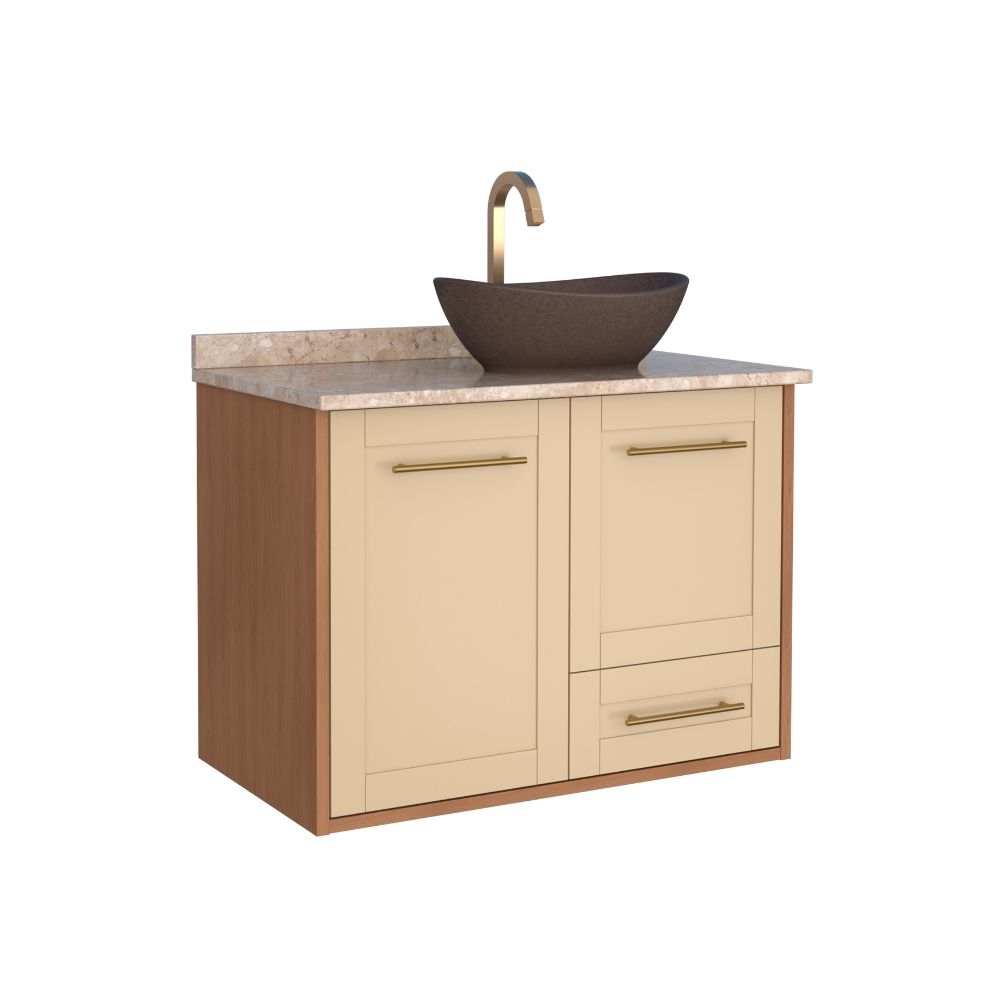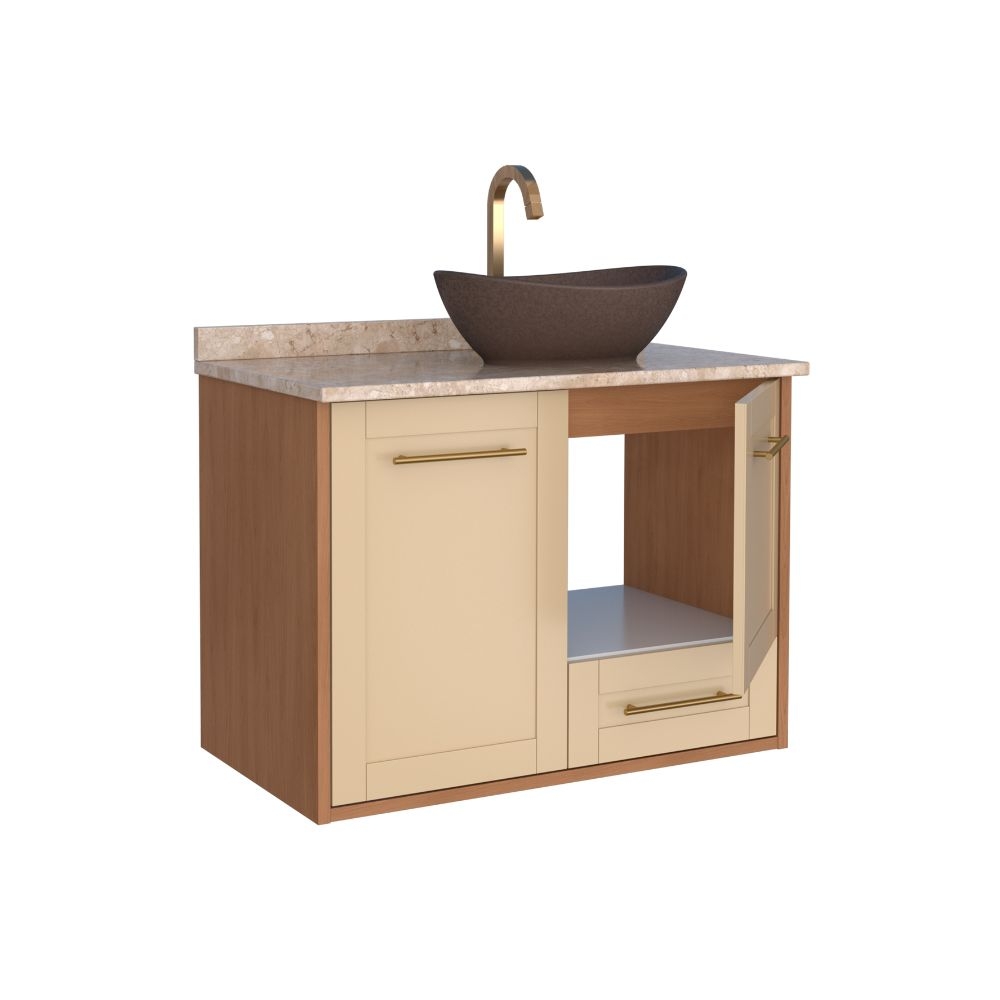 O banheiro em madeira Petúnia da Cozimax une o clássico ao moderno em um estilo provençal único. Ideal para banheiros com amplo espaço, ele conta com tampo em mármore travertino, frente com recobrimento para melhor acabamento e durabilidade, além de puxadores em alumínio, corrediças que deslizam fácil, portas com fechamento suave e prateleira para mais organização.