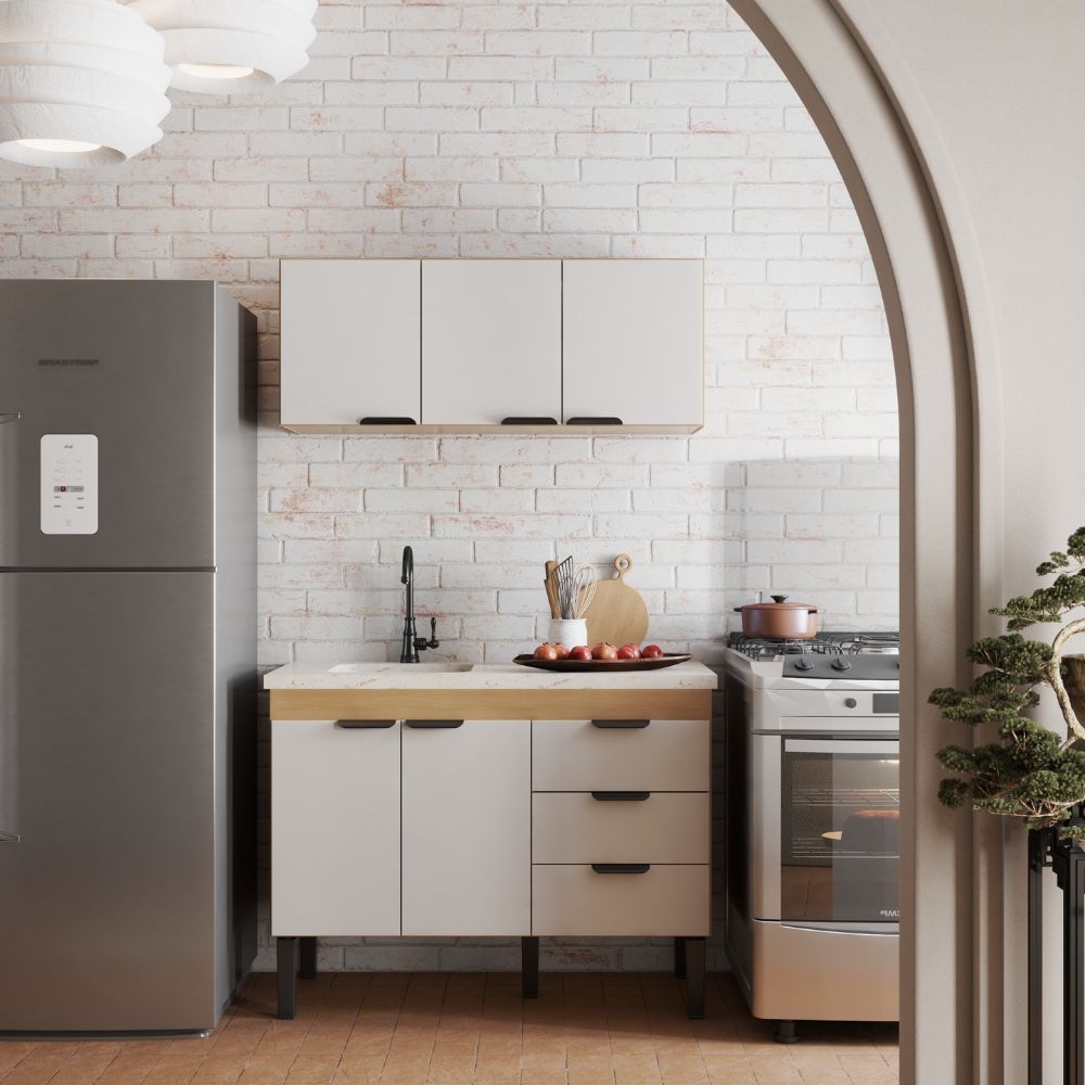 A linha de armários em madeira para cozinha Flamingo, da Cozimax, possui design único e inovador, com puxadores em formato minimalista, fabricado em chapas de madeira, gabinete com corrediças telescópicas e pés na cor preta com regulagem de altura.